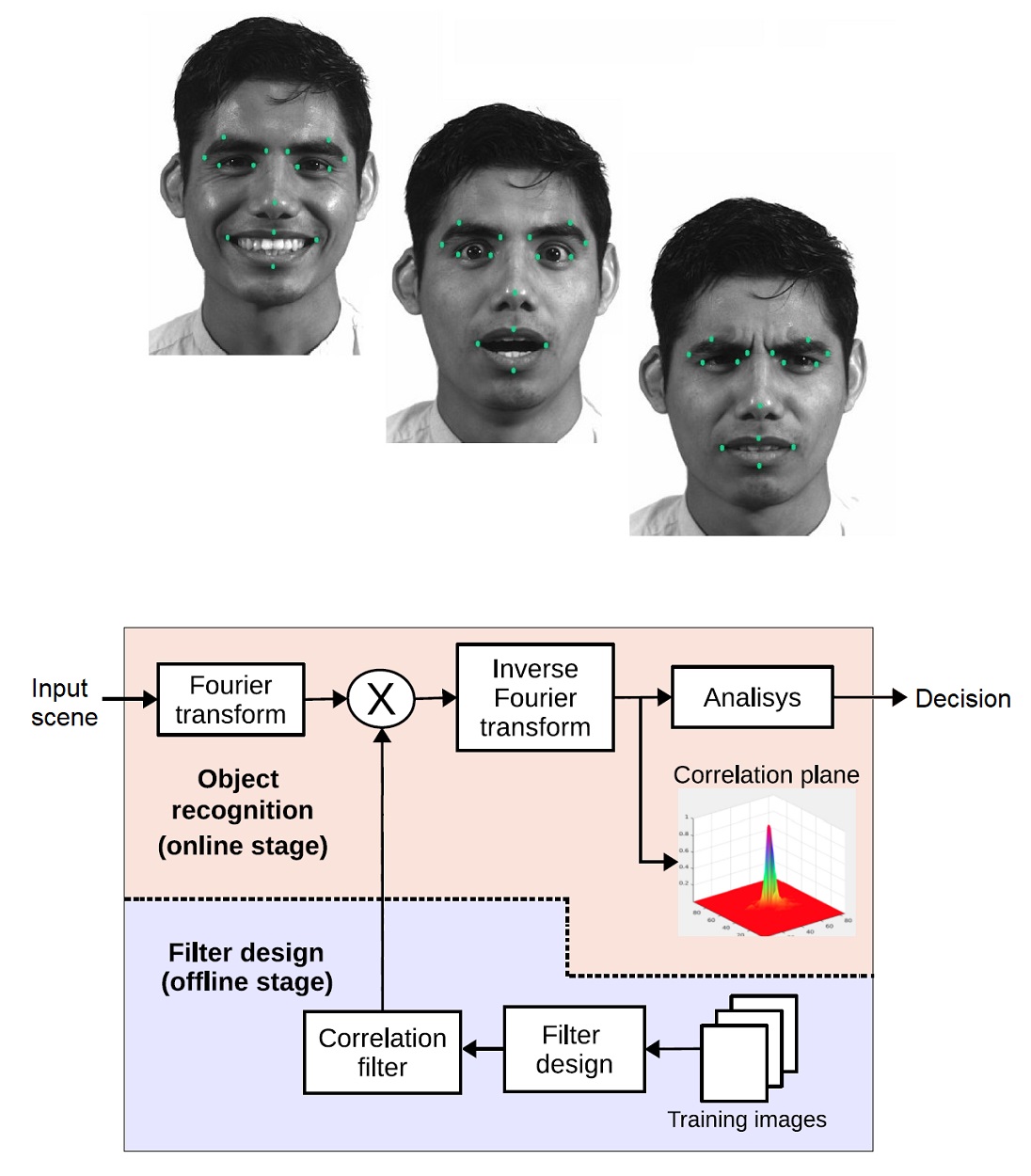 A reliable method for detection and tracking of facial landmarks is presented. A bank of composite matched filters is constructed given a set of prespecified facial landmarks in a reference face image. The filter bank is dynamically adapted to each captured frame by learning from current and past detections considering geometrical modifications.