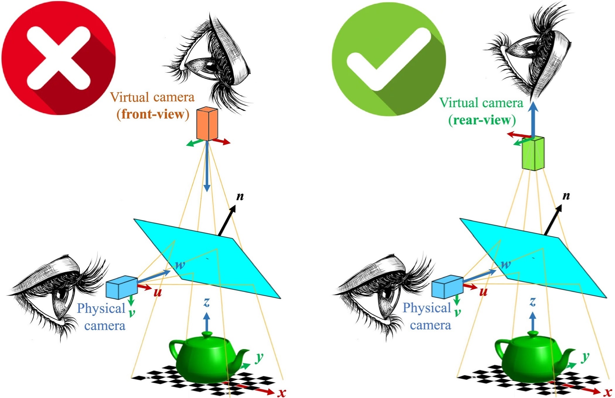 It is incorrect to assume that seeing through a mirror is equivalent to seeing from another position using front-view. The correct explanation requires the adoption of the virtual rear-view camera concept. The conception of virtual cameras operating in rear-view mode is counterintuitive, which may be why textbooks and specialized literature employ the erroneous front-view idea.