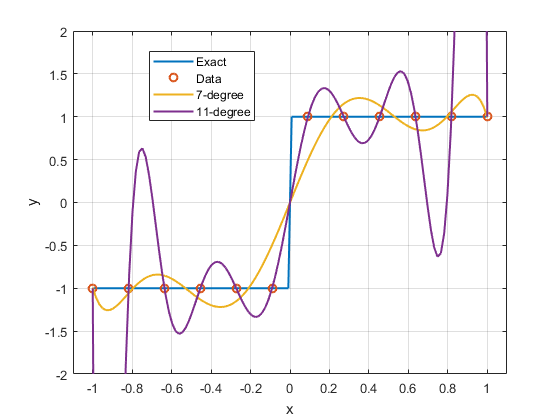 Ejemplo. Use un polinomio de grado 7 (obteniendo un ajuste de datos) y un polinomio de grado 11 (obteniendo interpolación de datos) para los siguientes datos.