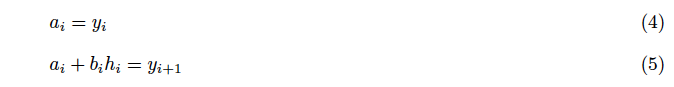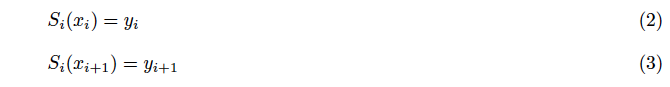 Para definir los coeficientes ai, y bi, se establecen las condiciones que deseamos se cumplan en cada intervalo. En la ecuación (2) se pide que los polinomios pasen por los puntos datos; es decir, sean polinomios de interpolación. La ecuación (3) pide que los polinomios adyacentes se conecten.