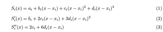 Consideremos un polinomio y = Si(x) de grados tres por cada intervalo [xi, xi+1]. Además, este polinomio tiene dos derivadas que se definen en las ecuaciones (2) y (3).