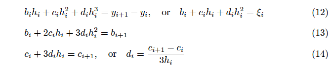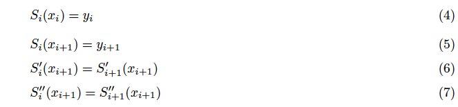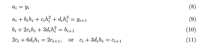 El problema ahora consiste en definir los coeficientes ai, bi, ci, y di. Para esto, se establecen las condiciones que deseamos se cumplan en cada intervalo. En la ecuación (4) se pide que los polinomios pasen por los puntos datos; es decir, sean polinomios de interpolación. Las siguientes tres restricciones son de continuidad: