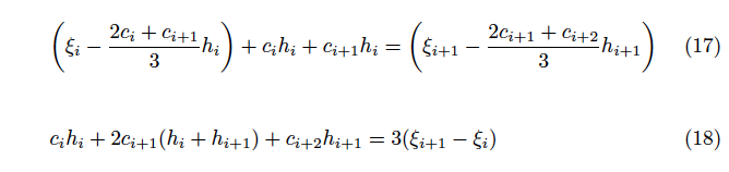 Para eliminar los coeficientes bi y bi+1 en la ecuación (16) usaremos la ecuación (15) dos veces: una en su forma original, i, y la otra para el polinomio i+1. Estas dos ecuaciones se usarán para sustituir los coeficientes bi y bi+1 en la ecuación (16) como se muestra en la ecuación (17). Con esto, reducimos el sistema de ecuaciones a solo la ecuación (18).